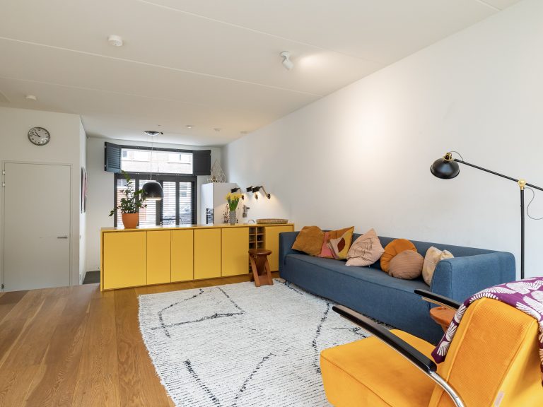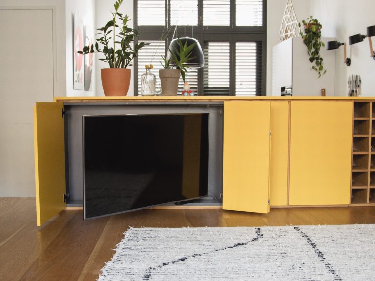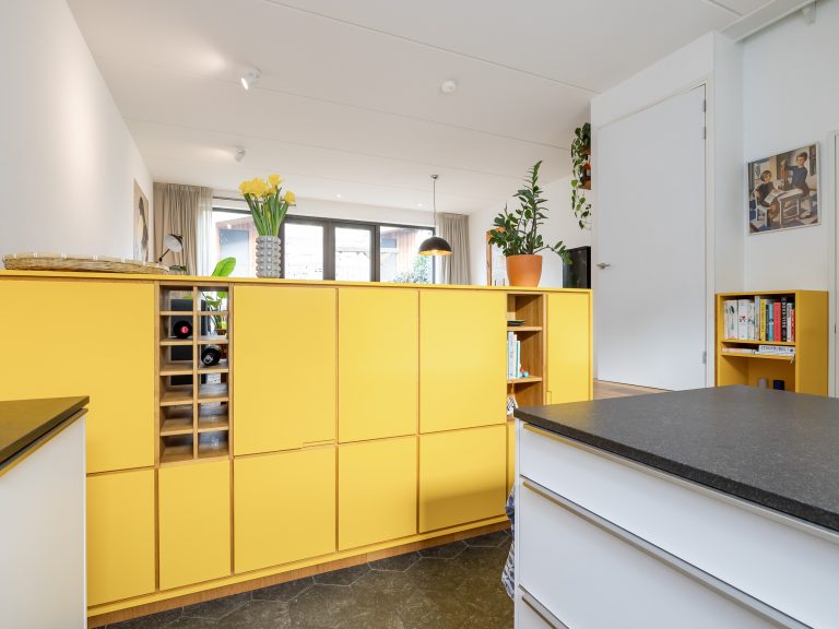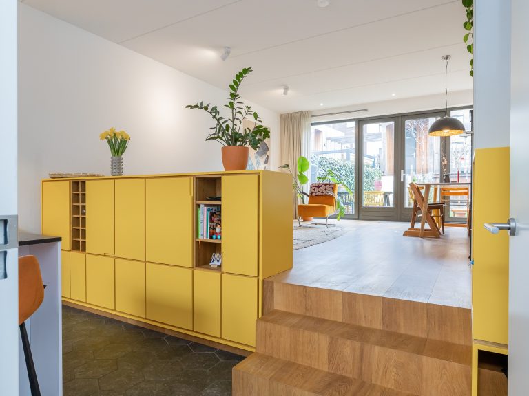 Het is een meubel met twee gezichten. Aan de keukenzijde lieten we fronten doorlopen naar beneden om de ruimte daar duidelijker te definiëren. Door de details in eikenhout oogt het geheel minder kolossaal. De houten vloer loopt nu naar beneden door en we plaatsen nieuwe tredes in hetzelfde materiaal. Daardoor oogt het meubel als een integraal, architectonisch element in de ruimte. De klant was niet bang voor een statement en ging mee in het advies om het geheel in een frisse gele kleur te laten spuiten. Door een klein kastje ernaast te plaatsen ontstaat een echte entree vanuit de keuken naar de woonkamer.