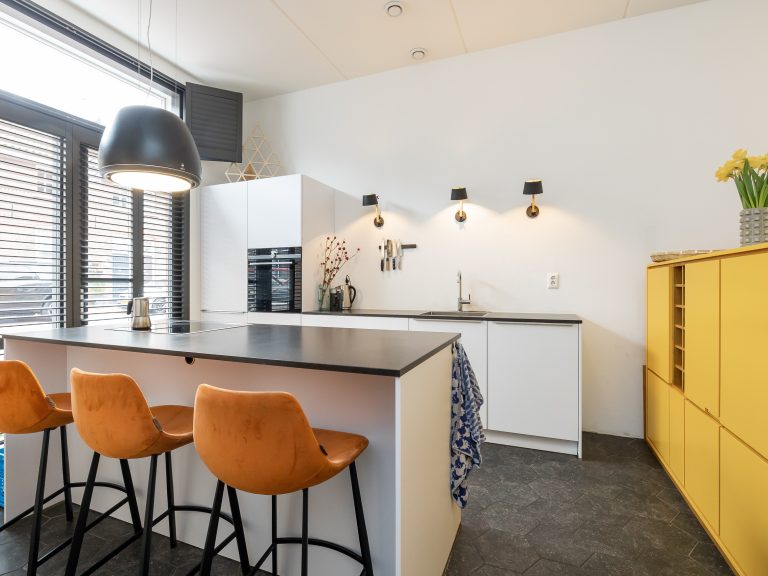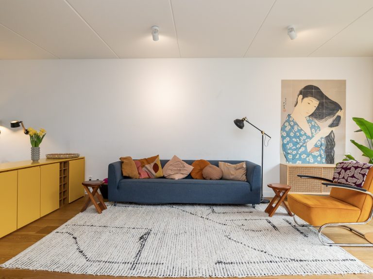 De bewoners van deze woning kwamen met een concrete wens voor een opbergmeubel. Maar we konden het niet laten en keken verder. We merkten een worsteling op met de gehele indeling van de woonkamer. Ze testten een week een variant, waarbij zit- en eetgedeelte werden omgedraaid. Dat beviel. Het contact vanaf de bank met gezinsleden in de keuken was prettig, maar het zitgedeelte had wél meer behaaglijkheid nodig. Aan Ruimtewezen daarom de taak om de scheiding tussen keuken en woonkamer opnieuw vorm te geven. We kwamen met iets onverwachts.